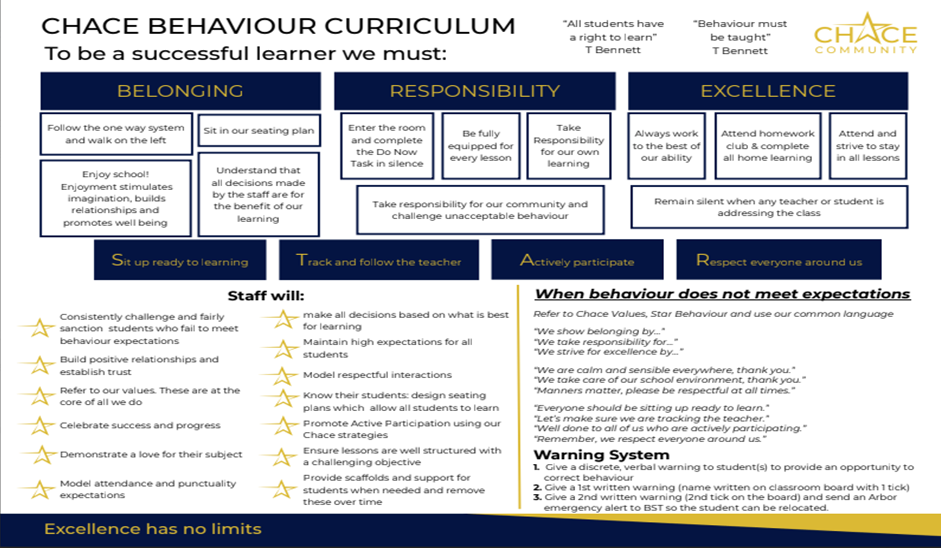We ensure a whole school approach and consistency in encouraging positive behaviour and explicitly teach these expectations through the Chace Behaviour Curriculum.